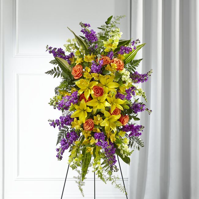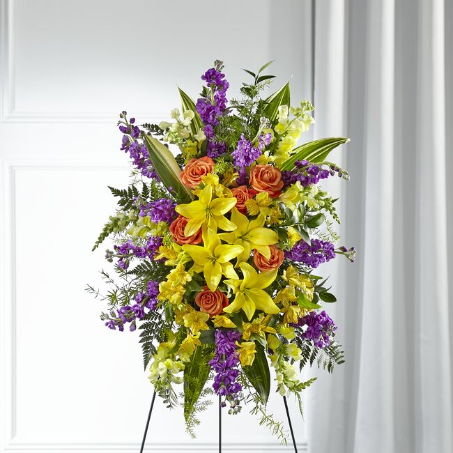 Our Thoughtful Prayers Standing Spray beautifully remembers their passion and radiance within each bright bloom. Bold lilies, roses, stock and snapdragons are paired with lush greens to celebrate the life of a loved one.